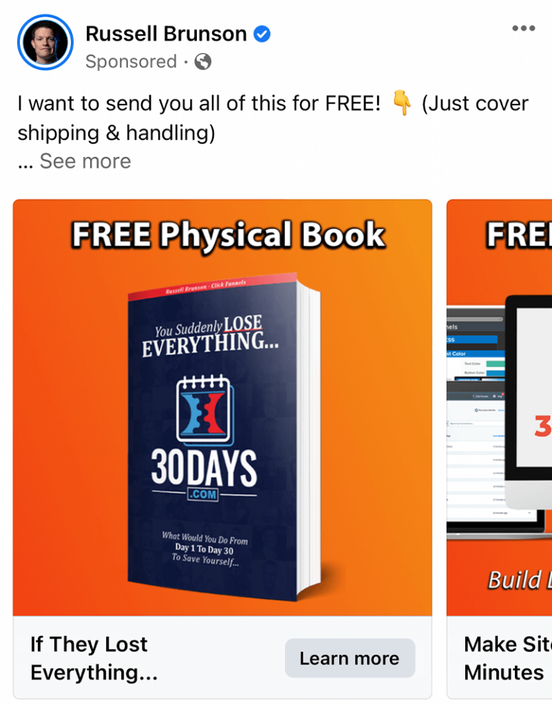 Cette publicité Facebook de style carrousel de Russel Brunson présente la bonne quantité d'informations que le public cible doit connaître. Le livre physique gratuit et les autres services sont mis en évidence avec un fond orange vif, qui est immédiatement perceptible parmi les autres contenus de votre fil d'actualité Facebook.