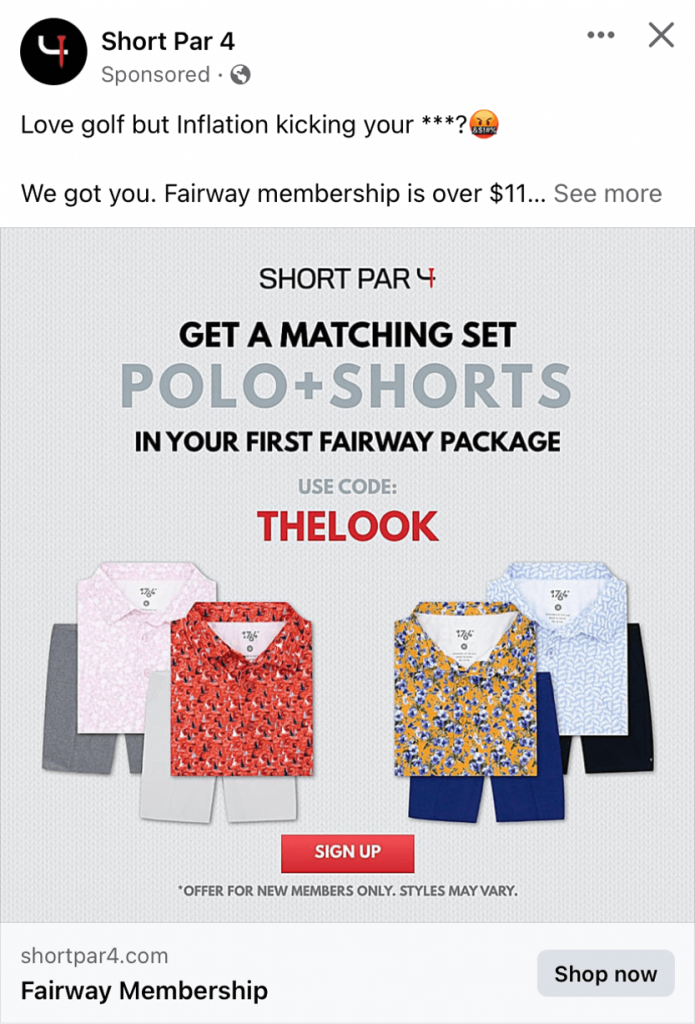Cette annonce courte Par 4 est un excellent exemple de la façon de tirer le meilleur parti d'un format d'annonce Facebook simple basé sur des images. La caractéristique frappante de cette annonce est l'utilisation de textes de différentes couleurs pour rendre le message global facilement compréhensible. Nous aimons particulièrement l'utilisation du rouge pour le code promo pour le rendre plus mémorable.