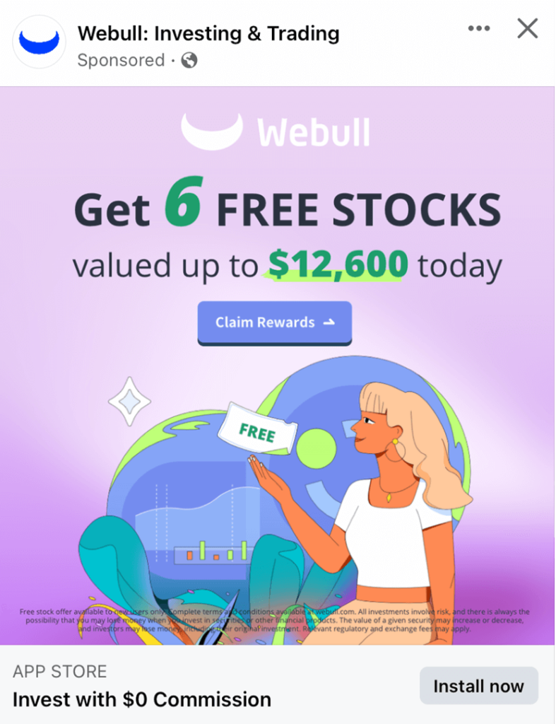 Plutôt que d'utiliser le texte principal, WeBull a intégré le message principal dans l'image comme une nouvelle approche. Et l'annonce a été liée à l'App Store pour que les utilisateurs intéressés puissent télécharger rapidement l'application WeBull.