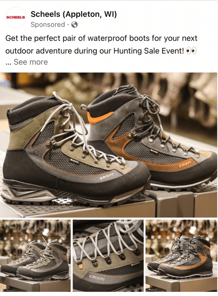 Cette publicité Facebook de Scheels a un design simple où l'accent est mis sur ses bottes imperméables. La marque a utilisé plusieurs images de haute qualité dans le format publicitaire de la collection pour représenter les différents styles de bottes qu'elle propose. Il a également mentionné les informations importantes concernant une vente qui inciteront sûrement les utilisateurs de Facebook à cliquer sur l'annonce pour obtenir une bonne affaire.