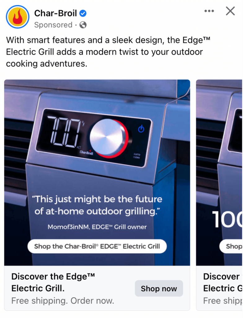 L'un des principaux objectifs de Char-Broil est de faire comprendre aux clients potentiels que ses produits sont bien plus qu'un gril extérieur. C'est pourquoi cette campagne publicitaire sur Facebook comprend plusieurs photos du « Edge Electric Grill », qui accompagnent les avis de clients satisfaits.