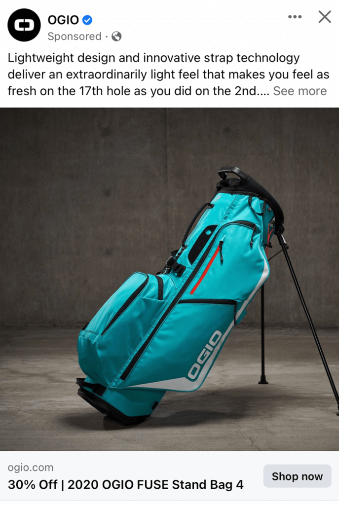 OGIO rend la plupart du format d'annonce illustrée disponible sur la plateforme publicitaire Facebook. La marque utilise uniquement l'image pour mettre en valeur l'un de ses sacs de golf bleu turquoise, qui semble plus visible en raison du fond gris uni. En dehors de cela, la zone de texte principale est utilisée pour fournir des informations sur les caractéristiques du sac, tandis que la description de l'image répertorie l'offre en cours.