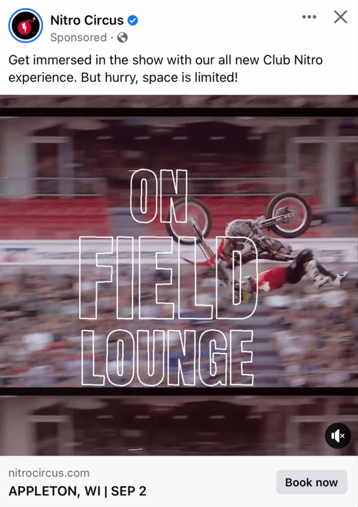 La première chose qui nous est venue à l'esprit après avoir vu cette campagne publicitaire de Nitro Circus était la vitesse. Et c'est essentiellement ce que l'entreprise veut que vous ressentiez à l'aide d'une vidéo de haute qualité bien montée et extrêmement engageante. Toutes les images ainsi que le texte animé agissent comme un crochet instantané qui incitera les utilisateurs intéressés à cliquer sur le bouton "Réserver maintenant".