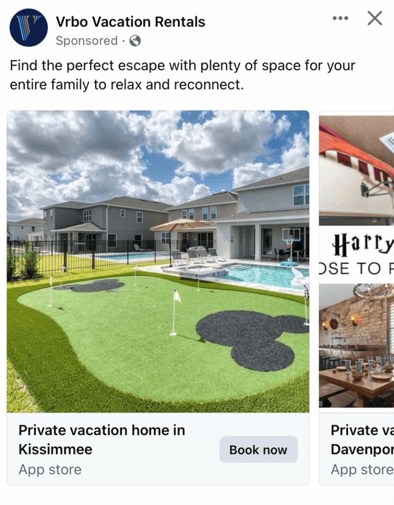 Il est essentiel de comprendre que dans le cas de certaines entreprises, rien ne fonctionne mieux que d'utiliser des publicités basées sur des images. Et l'un des meilleurs moyens de montrer plusieurs images consiste à utiliser les publicités carrousel Facebook, telles qu'utilisées par la société VRBO Vacation Rentals dans cette campagne publicitaire.