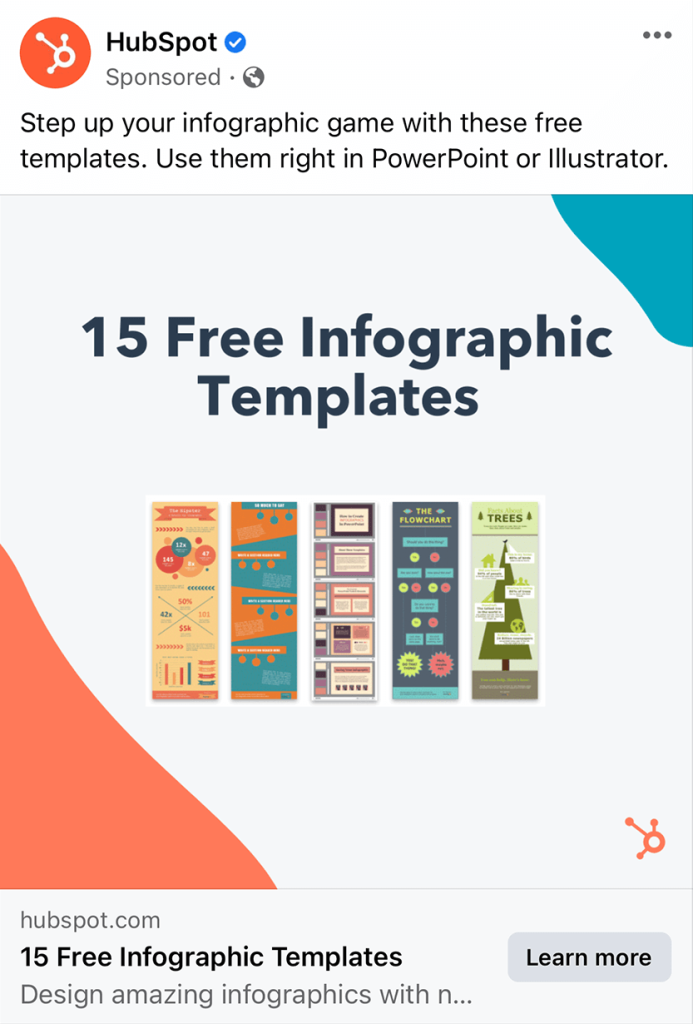 L'une des principales techniques utilisées par les entreprises lorsqu'il s'agit de campagnes publicitaires numériques est le ciblage de niche. Cette campagne publicitaire Facebook de HubSpot est spécifiquement destinée aux concepteurs ou à d'autres entreprises qui utilisent souvent l'infographie. C'est pourquoi le texte a été réduit au minimum et une plus grande attention a été accordée à l'affichage de quelques options de modèles sur l'image de l'annonce.