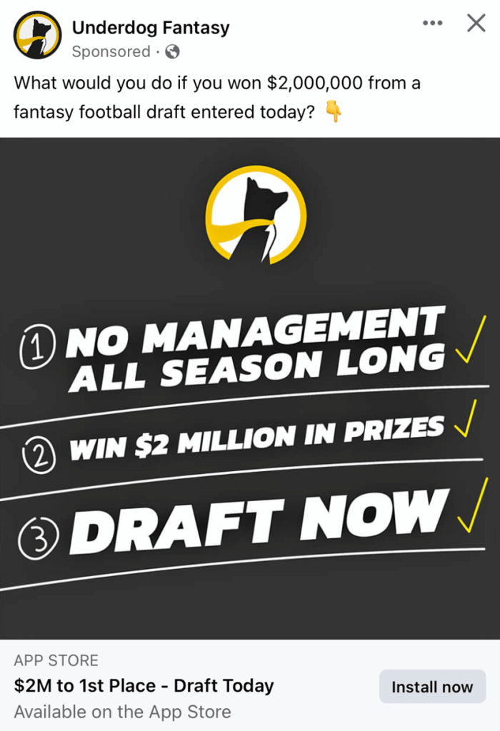Nous avons été assez surpris par cette campagne publicitaire Facebook d'Underdog Fantasy, car elle parvient à diffuser une publicité textuelle, qui est rarement utilisée pour promouvoir des applications de jeux en ligne. Cependant, l'entreprise connaît les attentes de son public cible et met en évidence les avantages associés dans l'image de l'annonce en utilisant du texte en gras.