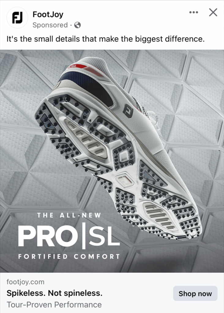Avez-vous pensé à créer une campagne publicitaire Facebook pour promouvoir un nouveau produit ? Inspirez-vous de celui-ci créé par FootJoy, car il est excellent pour mettre en évidence les meilleures caractéristiques de sa nouvelle chaussure avec l'utilisation d'une image de haute qualité.