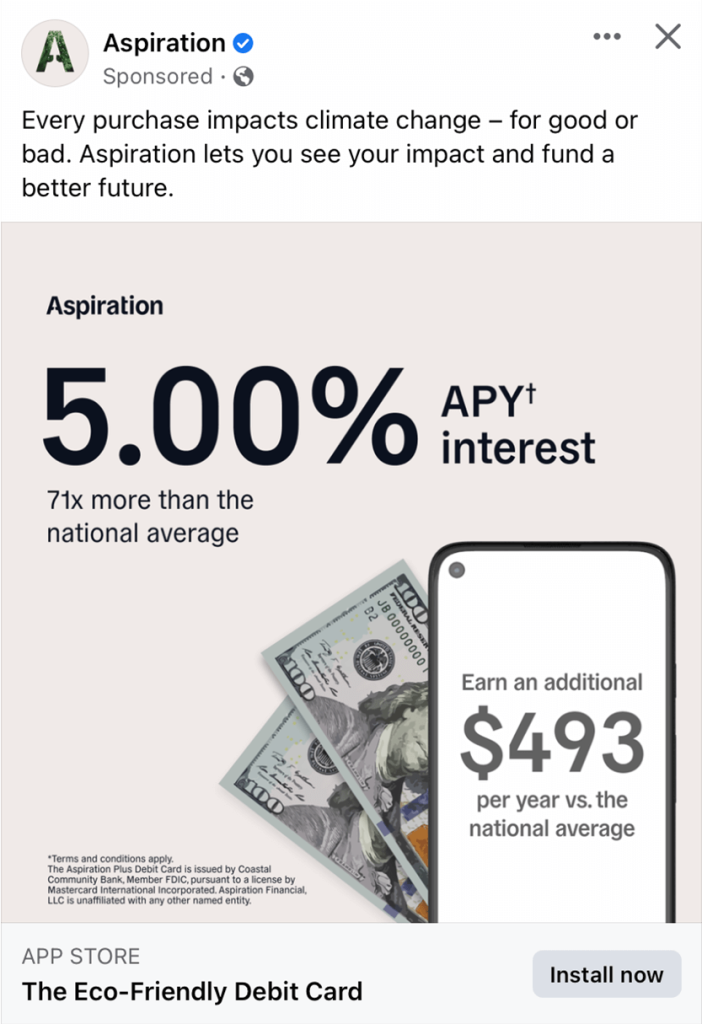 Il peut être assez difficile de concevoir des campagnes publicitaires Facebook pour des produits financiers, mais celle d'Aspiration a un impact en mettant en évidence la rentabilité. Cette campagne peut être considérée comme comportant beaucoup de texte en raison de l'utilisation de chiffres, mais l'image supplémentaire du papier-monnaie crée un contraste qui attire l'attention.