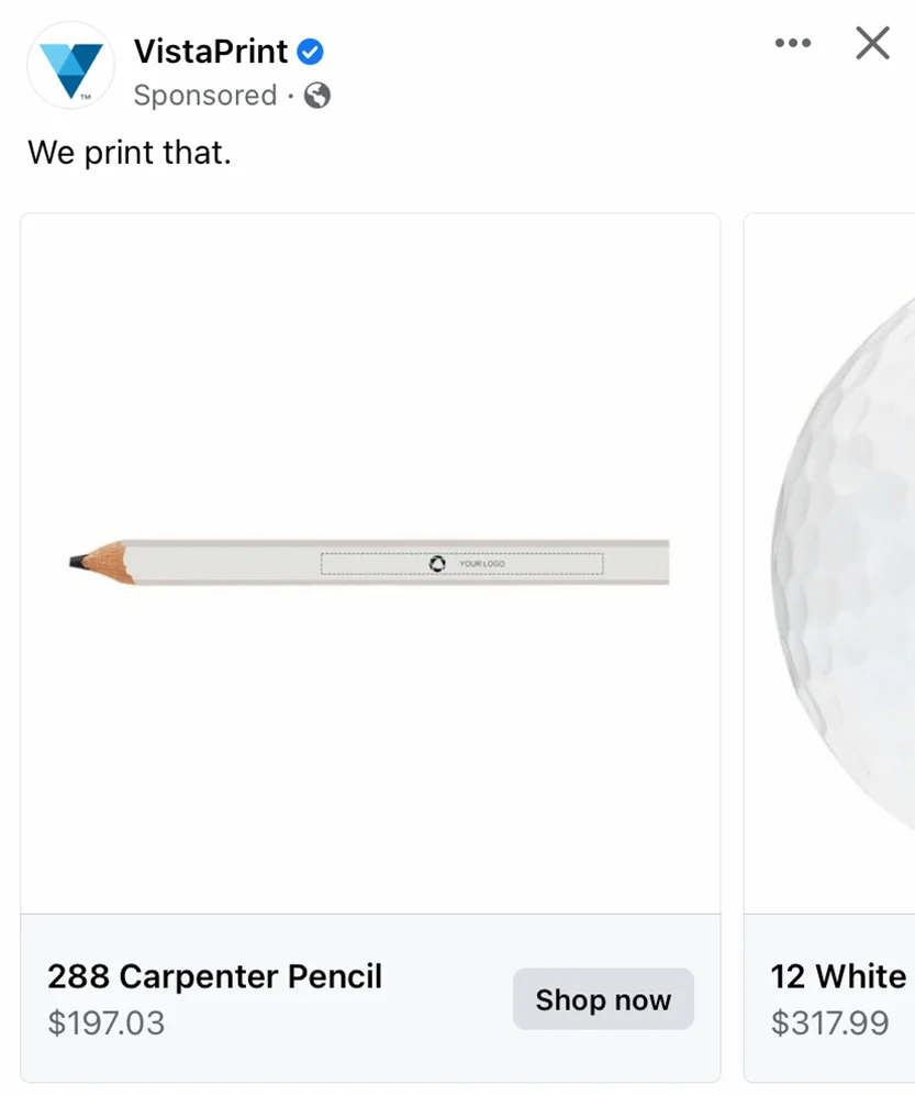 L'une des meilleures caractéristiques de cette annonce carrousel VistaPrint est qu'elle se fond parfaitement avec l'interface utilisateur typique de Facebook en raison des arrière-plans blancs des images. Par ailleurs, la marque a utilisé un texte court et efficace avant les images pour orienter l'intérêt vers les services mis en avant.