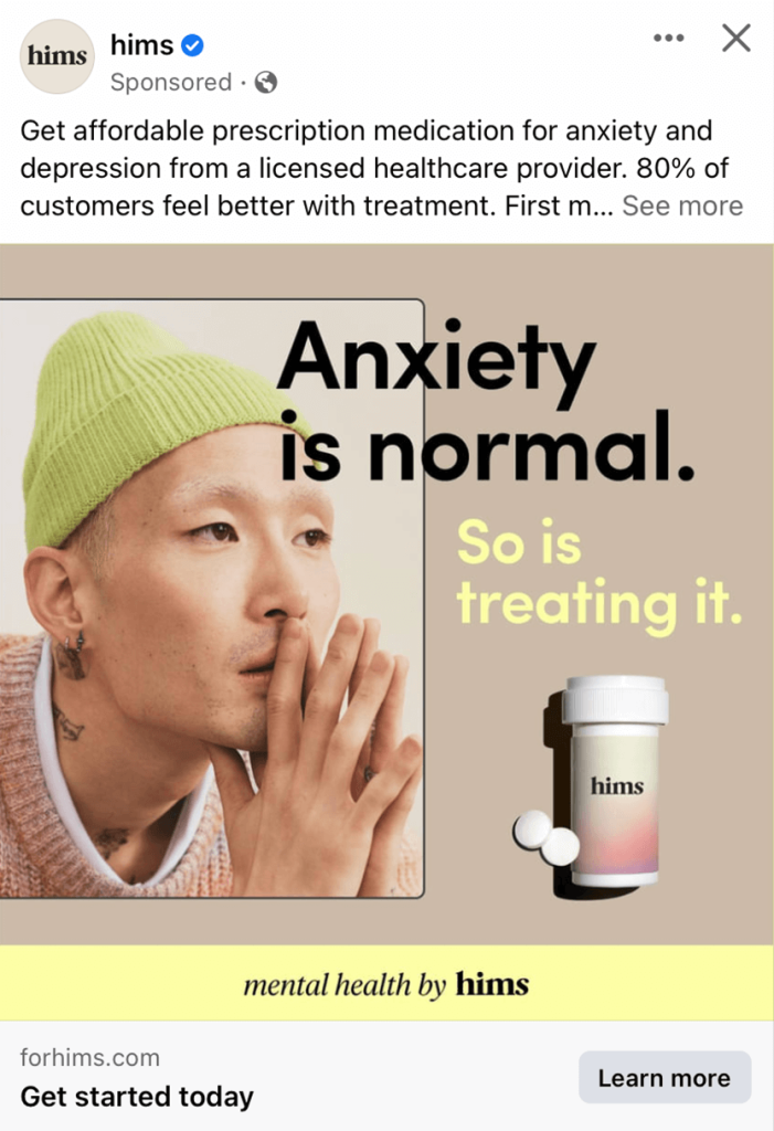 Cette campagne publicitaire Facebook de Hims utilise un design minimaliste et moderne qui plaira à un jeune public masculin. Nous apprécions vraiment l'utilisation de couleurs pastel douces comme le beige et le jaune car elles conviennent pour transmettre des informations sur des sujets graves comme l'anxiété ou la santé mentale.