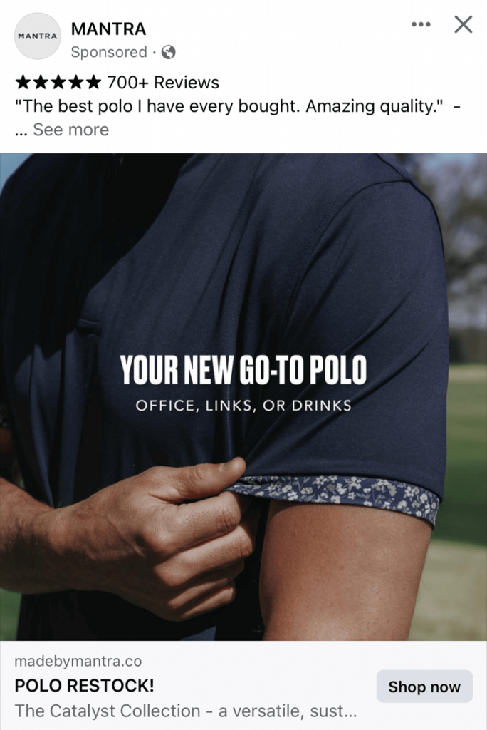 Cette campagne publicitaire Mantra sur Facebook a un design simple car elle est destinée à promouvoir le réapprovisionnement d'un produit populaire, les t-shirts polo. Par conséquent, la marque a mentionné certaines des critiques dans le texte principal ainsi que le nombre de critiques que le produit a reçues.