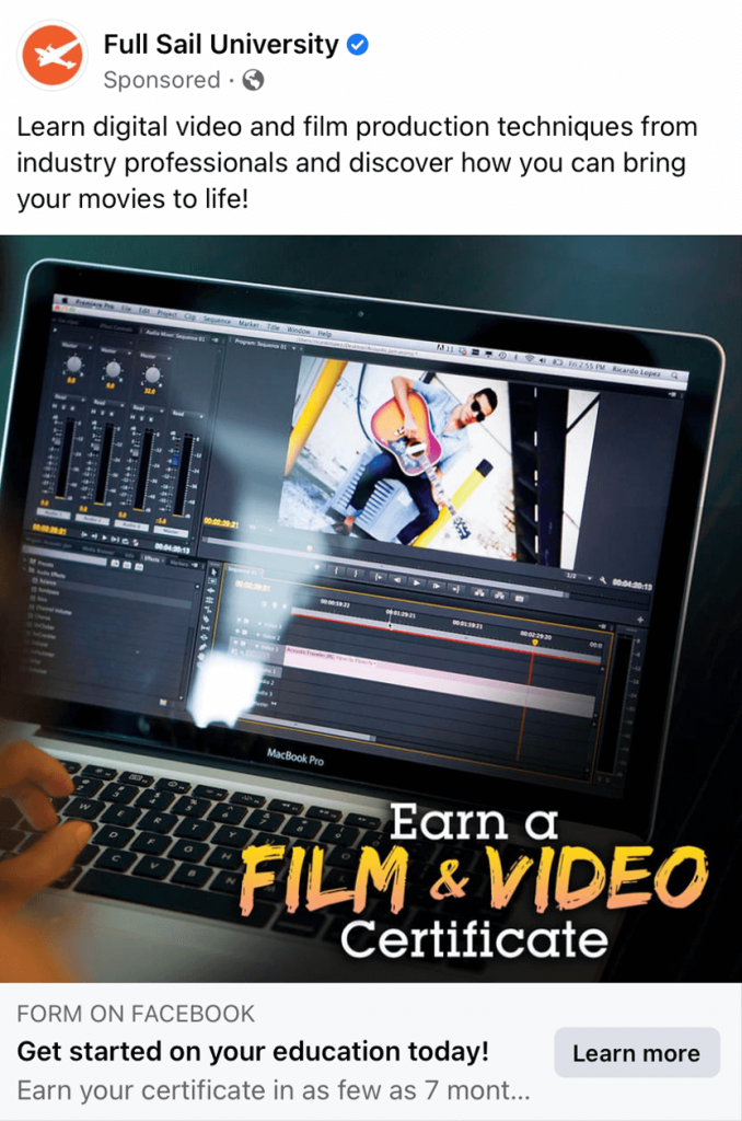 Concevoir une publicité pour une institution universitaire peut être difficile, mais cela a été assez bien fait dans cette campagne publicitaire Facebook pour Full Sail University. Les choses sont restées simples car elles incluent une image simple couplée à un peu d'informations sur l'institution, qui agit comme un crochet pour les utilisateurs Facebook intéressés.