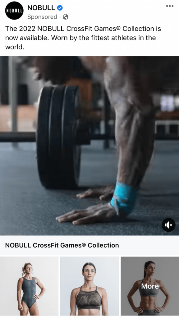 NOBULL est une autre marque qui utilise stratégiquement le format de publicité vidéo Facebook pour montrer sa nouvelle collection. Mais, cette fois, la vidéo est accompagnée d'images des produits, ce qui fait de cette campagne un hybride entre la vidéo et les publicités de collection. Nous pensons que ce format convient particulièrement aux utilisateurs de smartphones sur Facebook, car la publicité peut remplir tout leur écran, ce qui attire davantage l'attention.