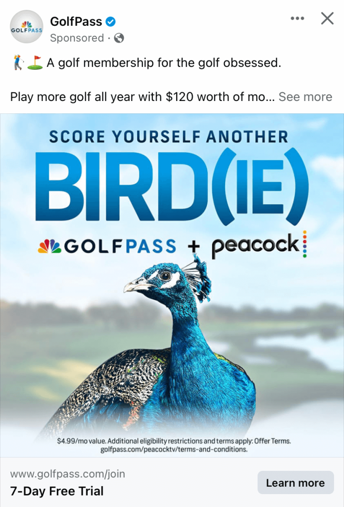 Nous apprécions également le fait que la société ait fourni des informations supplémentaires sur les avantages de l'adhésion dans le texte au-dessus de l'image. L'annonce présente même une image réelle d'un paon et un lien vers l'essai gratuit pour permettre aux utilisateurs de Facebook d'essayer immédiatement le programme.