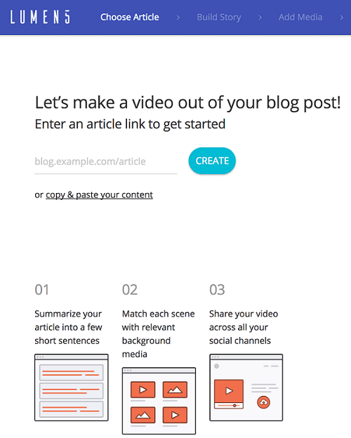 Après une inscription rapide, vous pourrez utiliser Lumen5 gratuitement pour créer des vidéos courtes et partageables à partir de n'importe quel lien.