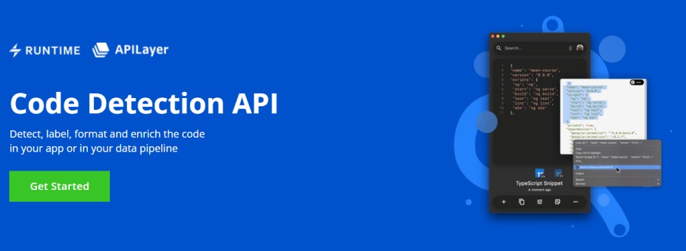Avec l'API de détection de code, vous obtenez une API de traitement de langage technique. Cette API est optimisée par Runtime et vous aidera à étiqueter les données et à enrichir vos ensembles de données plus volumineux avec des méta-informations et un langage de code pertinents.