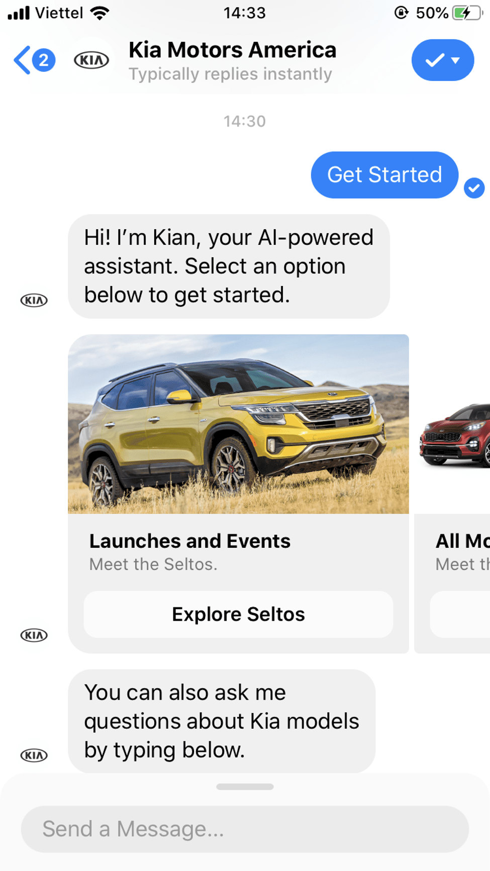 Un autre exemple est le Facebook Messenger Bot de Kia Motors America. L'assistant alimenté par l'IA vous guide pour obtenir les informations dont vous avez besoin en vous demandant de choisir parmi différentes options. Peu à peu, cela vous rapproche de ce dont vous avez besoin.