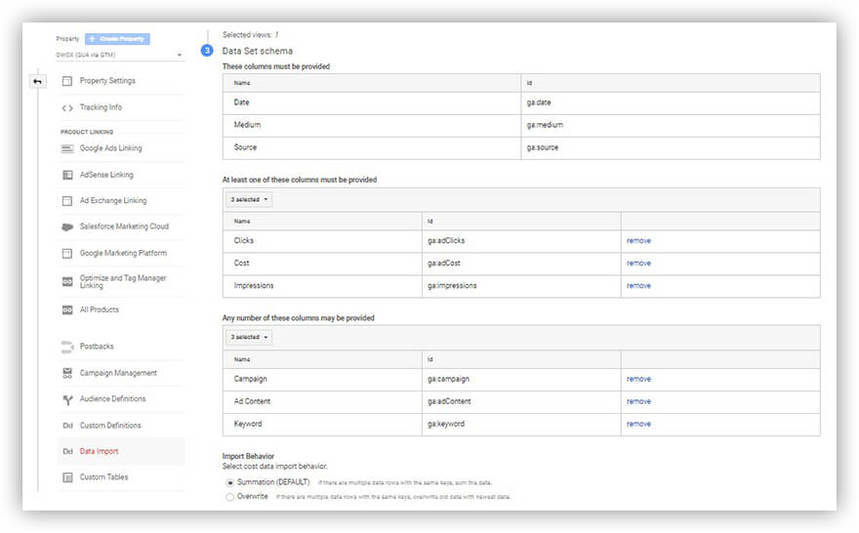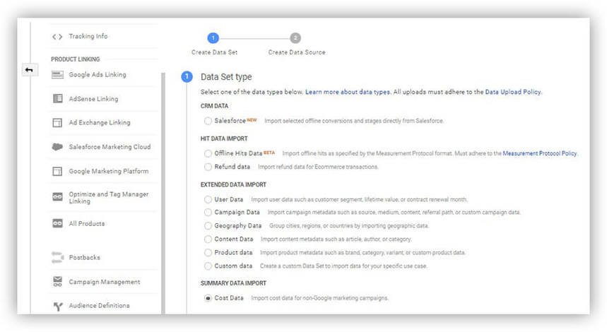 Pour transférer les données de coût, vous devez créer un ensemble de données dans Google Analytics :