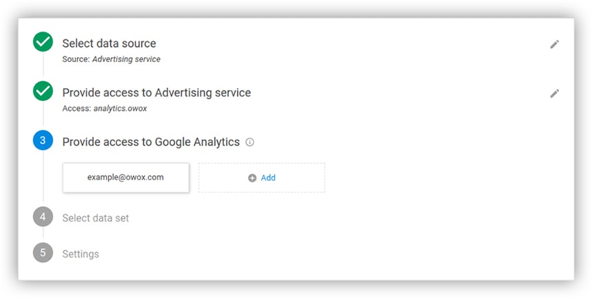 Nous allons vous montrer comment configurer rapidement le transfert automatique de données vers Google Analytics à l'aide d'OWOX BI Pipeline en deux étapes. Après avoir configuré ce pipeline, OWOX téléchargera régulièrement vos données Facebook Ads collectées sur Google Analytics.