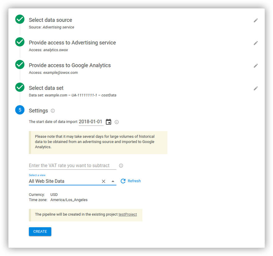 Passons maintenant à la dernière étape : cliquez sur Créer. C'est tout! Les données de coût pour les publicités Facebook seront automatiquement transférées à Google Analytics.