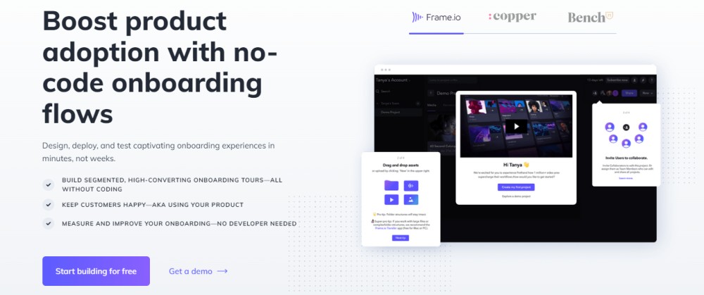 La plate-forme aide les utilisateurs à intégrer facilement et vous permet d'améliorer l'expérience dans l'application au bon moment et aux bonnes personnes dans leurs parcours d'utilisateurs. Il offre une adoption efficace des fonctionnalités et un centre de ressources utiles où vous pouvez apprendre à tirer le meilleur parti de votre pile technologique.