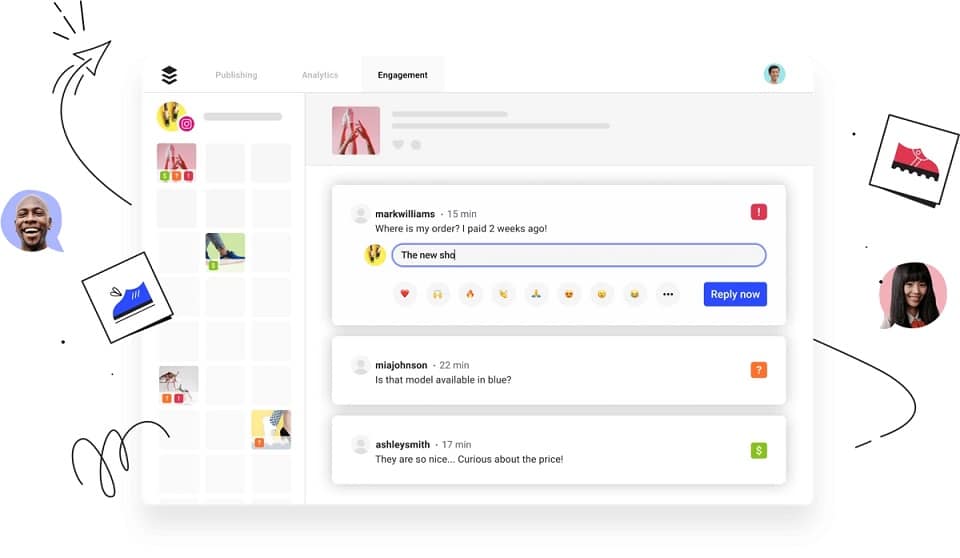 Vous pouvez rapidement vous connecter avec les abonnés (à l'aide de raccourcis clavier et d'emojis intelligents) en répondant aux commentaires depuis le tableau de bord principal, et Buffer utilise l'apprentissage automatique pour hiérarchiser les commentaires en fonction de leur contenu.