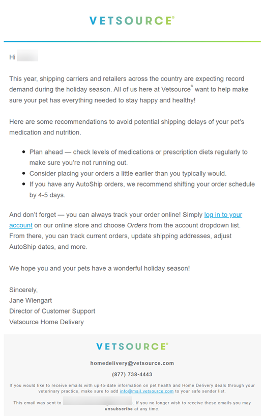 Dans cet exemple, Vetsource réitère son objectif de garder les animaux de compagnie heureux et en bonne santé tout en rappelant aux abonnés de planifier à l'avance pendant la saison chargée des fêtes. Ils proposent des étapes pratiques pour remédier à tout retard d'expédition ou de transporteur et mettent en évidence leur portail de compte client, où les patients peuvent confirmer et mettre à jour leurs données personnelles. Ils évitent le malheur des notifications de retard d'expédition et présentent plutôt leurs messages comme utiles, sensibles au facteur temps et axés sur le bien-être.