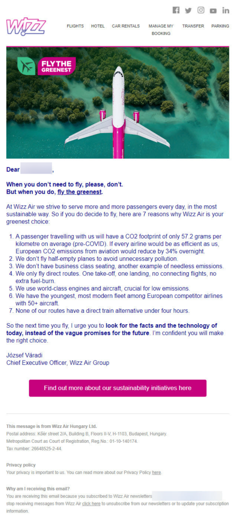 Wizz Air évite de faire les déclarations de durabilité parfois vagues pour lesquelles tant d'autres entreprises ont été examinées. Dans cette lettre du PDG, Wizz Air utilise le canal de courrier électronique pour articuler clairement sa philosophie verte et décrit les mesures prises pour réduire son impact écologique.