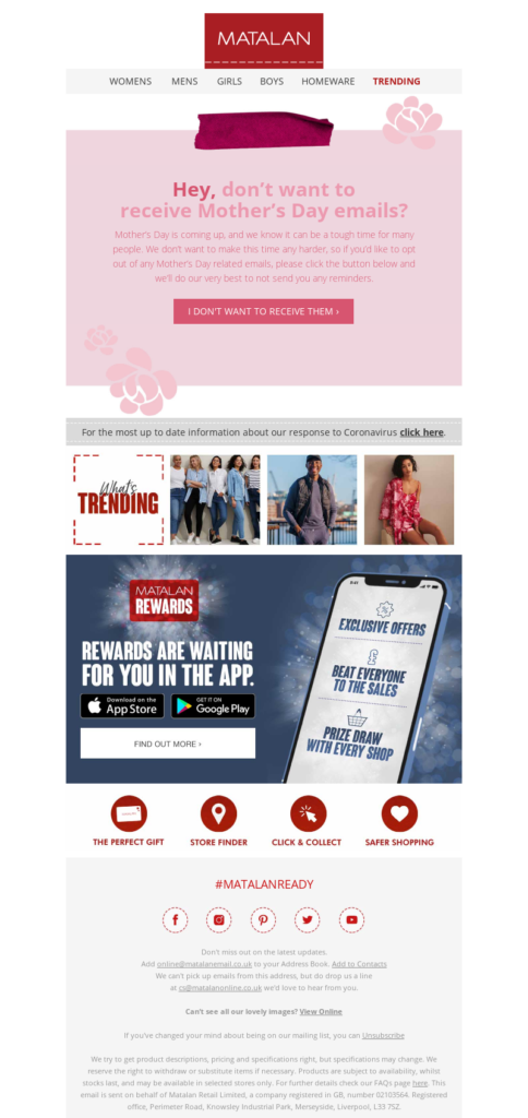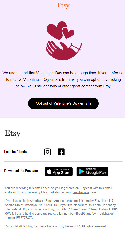 Prenez ces messages de désinscription d'Etsy (Saint-Valentin) et de Matalan UK (Fête des Mères), par exemple. Ces e-mails permettent aux abonnés de se retirer des communications par e-mail spécifiques aux vacances sans avoir à se désabonner de l'ensemble du programme de messagerie.