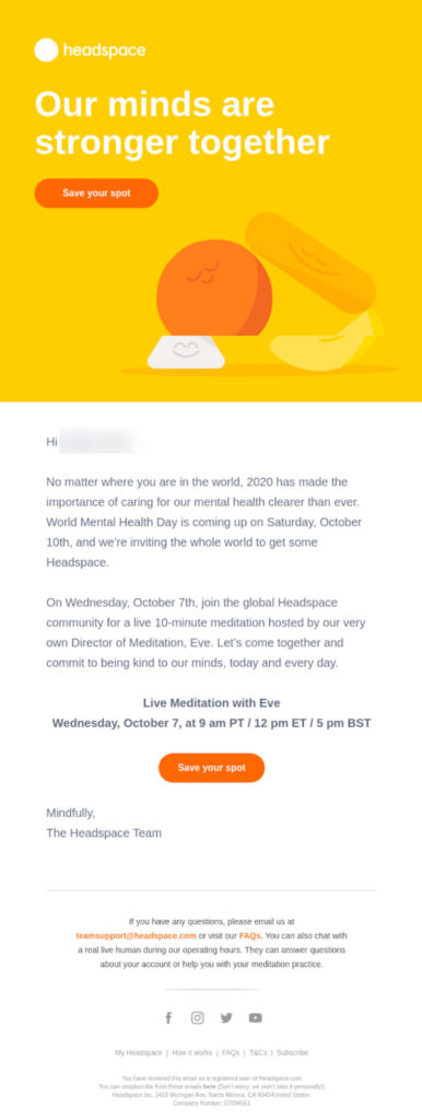 Headspace l'exécute parfaitement dans l'e-mail ci-dessous. En reconnaissant les besoins en santé mentale associés à l'isolement induit par la pandémie et en fournissant un contenu engageant sans CTA "Acheter maintenant", ils réussissent à apporter de la valeur, à exprimer de l'empathie et à rester fidèles à leurs principaux objectifs commerciaux.