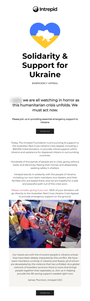 Dans l'exemple ci-dessous, Intrepid reconnaît la crise en Ukraine et fait appel à son public pour des dons. Ils ont profité de l'occasion pour partager leur partenariat et leur soutien à la Croix-Rouge, notant que les dons sont les bienvenus si l'abonné est en mesure de faire un don.