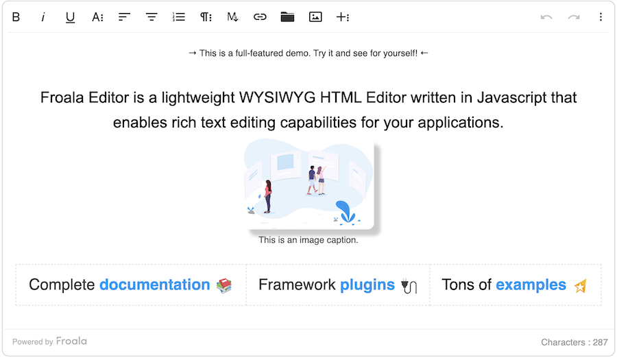 Froala est un éditeur HTML WYSIWYG créé pour faciliter la vie des développeurs. Grâce à son API et à sa documentation robustes, les développeurs peuvent connecter Froala à leur application existante et commencer à l'utiliser en quelques minutes.