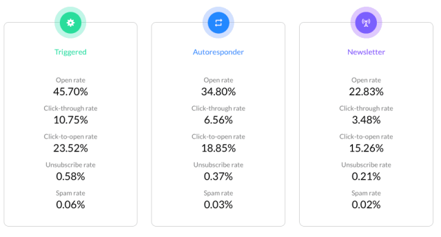 D'après mon expérience, notre benchmark a montré que les statistiques de campagnes automatiques sont généralement plus élevées que celles des newsletters. Cela a du sens, car les campagnes sont pertinentes pour les destinataires, ce qui augmente leur engagement.