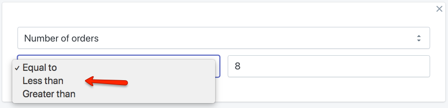 Semblable à la règle Argent dépensé, vous pouvez créer un segment de clients qui ont confirmé plus, moins ou un nombre exact de commandes sur votre site.