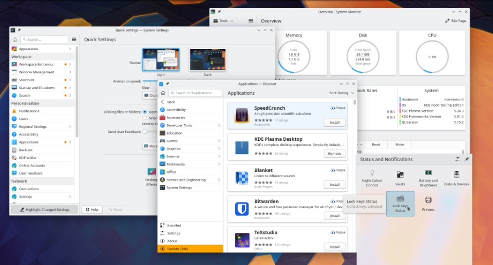 KDE Plasma est livré avec de nombreuses applications intégrées d'un large éventail de genres, y compris les outils de développement, l'éducation, les jeux, les graphiques, le multimédia et d'autres utilitaires de sécurité. Vous pouvez voir toutes les applications disponibles pour KDE Plasma ici.