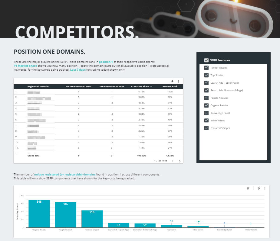 Luminr surveille également vos concurrents, donc au lieu de simplement voir vos performances sur différents éléments du SERP, vous pouvez également voir comment vos concurrents se comparent. Cela vous donne un aperçu considérable de leurs stratégies, de ce sur quoi ils se concentrent et des lacunes sur lesquelles vous pouvez capitaliser.