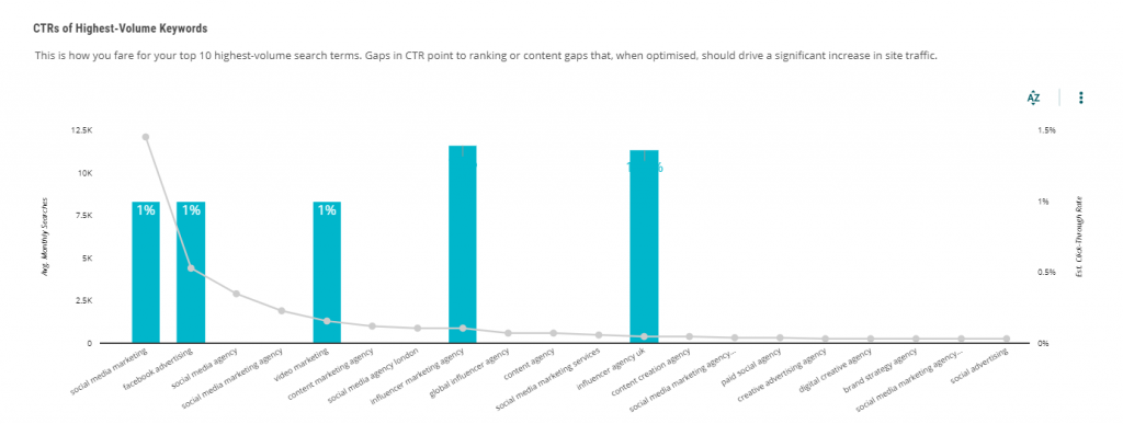Cela peut être divisé comme vous le souhaitez, depuis l'examen de mots-clés individuels jusqu'à vos portefeuilles cibles et les mots-clés qu'ils contiennent. Ci-dessus, vous trouverez un exemple de la manière dont vous pouvez explorer le CTR spécifiquement pour les mots-clés ayant le volume de recherche le plus élevé, en examinant en quoi cela diffère selon les termes.