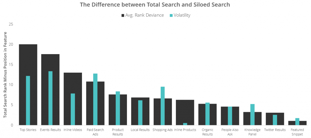 Là où nous avons constaté l'écart de classement le plus flagrant, ce sont les annonces de recherche payantes, principalement en raison de leur répartition entre le haut et le bas du SERP. Hormis les publicités, la position des actualités et des événements à la une sur le SERP est très volatile, souvent enfouie entre 18 et 20 espaces plus bas. Les résultats organiques sont beaucoup moins volatils mais apparaissent en moyenne 5 à 6 positions plus bas que ce qu'une équipe SEO puriste pourrait les évaluer.