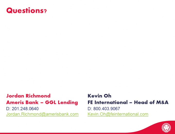 Kevin Oh [00:00:57] Super – Merci pour cela. Et pour ceux d'entre vous qui ne connaissent pas FE International et moi-même. Je m'appelle Kevin Oh. Je suis à la tête de l'équipe M&A chez FE International. Nous sommes spécialisés dans les activités en ligne, donc le commerce électronique, le SaaS et le contenu. Nous existons depuis 10 ans. Nous avons couvert des transactions aussi basses que 50K, mais ensuite jusqu'à 50-100M. Mais nous faisons beaucoup de transactions dans la fourchette de 1 à 5 millions de dollars, ce qui est un bon endroit pour les transactions SBA. Nous entretenons également de bonnes relations avec Jordan chez Ameris Bank et un certain nombre de transactions précédentes, auxquelles nos téléspectateurs ici pourront se référer dans notre article de blog. Mais Jordan, merci d'avoir pris le temps. Il y a trois domaines que je veux couvrir lors de l'appel d'aujourd'hui. Premièrement, si vous pouviez nous donner juste un rappel du programme SBA, car il pourrait y avoir des gens qui écoutent qui ne sont pas aussi familiers ou qui pourraient utiliser un rappel. Ce serait donc très utile. Et puis numéro deux, nous avons quelques questions courantes que nous recevons des investisseurs de notre réseau et que je voulais vous poser lors de la séance d'aujourd'hui. Troisièmement, nous savons que COVID-19 a eu un impact important sur l'industrie SBA, et donc si vous pouviez parler un peu de l'impact et de ce à quoi nous devrions nous attendre à l'avenir, je pense que c'est un bon ordre du jour pour la session d'aujourd'hui .