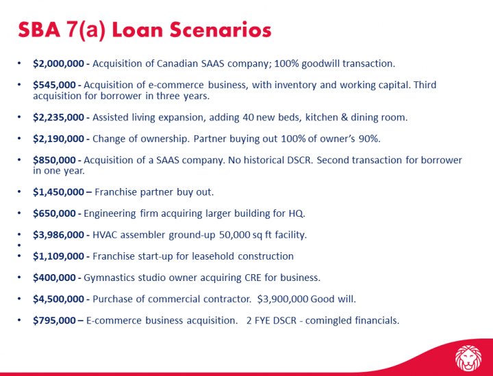 Jordan Richmond [00:05:54] Et comme je l'ai dit, nous pouvons entrer dans toutes les exigences de garantie, les exigences de garant, et des choses comme ça à la fin de la présentation. Mais oui, comme je l'ai dit, le programme 7(a) est vraiment le- c'est le moyen d'avoir des actifs incorporels pour financer une transaction de bonne volonté. Un prêteur est autorisé jusqu'à une transaction non garantie. Vous n'avez pas besoin d'être entièrement garanti. Ce programme 7(a) atteindra jusqu'à 5 millions de prêts. Ils sont entièrement amortis. En règle générale, une transaction de goodwill sera presque invariablement amortie sur 10 ans. Il n'y a pas de ballons ou d'appels avec un prêt 7(a) par conception, et les prêts peuvent être pour le fonds de roulement, les machines, l'équipement, les stocks. Et dans le cas de l'acquisition d'une entreprise, il sera presque toujours que l'achalandage en sera la composante la plus importante et peut-être peut-être aussi des stocks et des fonds de roulement. Et les taux seront étalés sur les taux préférentiels des prêts, et ils varient en fonction du montant de la garantie dans la transaction. Et encore une fois, je vais m'arrêter là avant de prendre les informations que nous venons de voir. Et maintenant, je peux me pencher sur les acquisitions d'entreprises que nous avons faites ici. Vous pouvez voir comment vous pouvez utiliser le programme d'établissement. Avant de faire cela, cependant, avez-vous d'autres questions dont vous souhaitez également discuter ?
