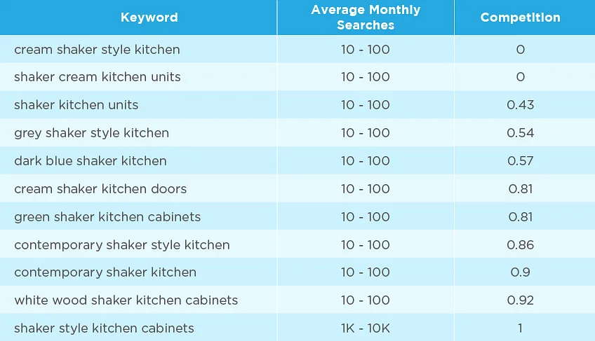 D'autre part, "portes de cuisine shaker à la crème" obtient un volume de recherche minimal dans la même gamme, mais c'est un mot-clé quelque peu compétitif. Vous aurez probablement plus de mal à obtenir des résultats de recherche avec ce mot-clé, vous devez donc peser cela par rapport au faible volume de recherche. À l'autre extrémité du spectre, les "armoires de cuisine de style shaker" reçoivent des milliers de recherches par mois, mais sont très compétitives, donc plus difficiles à gagner, ce qui fait des "portes de cuisine de style shaker" un choix plus attrayant.
