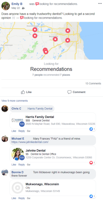 Disons qu'un utilisateur recherche des recommandations pour un dentiste dans votre région. Lorsque les utilisateurs commentent avec des recommandations, Facebook reconnaît l'entreprise, la marque dans la publication et ajoute même son emplacement à la carte. En tant qu'entreprise de services locale, vous serez non seulement visible pour l'utilisateur qui a posé la question, mais également pour toute autre personne qui voit la publication.