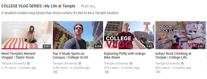Temple a également maîtrisé la vidéo, créant des vidéos convaincantes de qualité professionnelle et mettant en vedette leurs étudiants dans une série YouTube « Jour dans la vie » centrée sur les étudiants, où les étudiants de Temple deviennent des vloggers. À travers leur contenu, ils capturent leur campus sous de nombreux angles et montrent à quoi ressemble vraiment la vie étudiante, afin que les futurs étudiants puissent s'imaginer y assister à l'avenir.