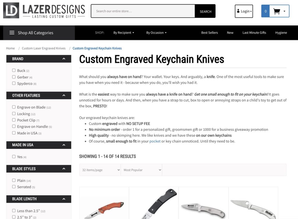 Par exemple : pour le mot-clé « couteaux porte-clés gravés personnalisés », LazerDesigns.com a créé une page utile avec seulement 162 mots de contenu et une grille de produits.