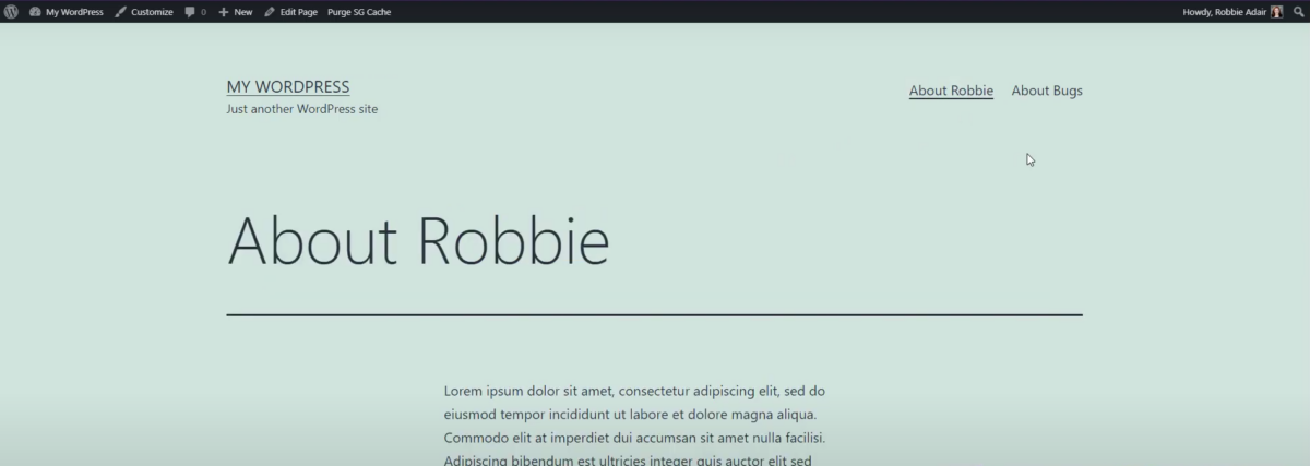Sur la page d'accueil, nous avons les articles du blog, donc nos messages sont ici sur la page d'accueil. Je tiens à souligner que celui-ci tout en haut est un post collant, et j'expliquerai pourquoi c'est important plus tard. Ensuite, nous avons créé deux pages, l'une sur l'un de nos auteurs "Robbie", et l'autre sur "Bugs", notre autre auteur.