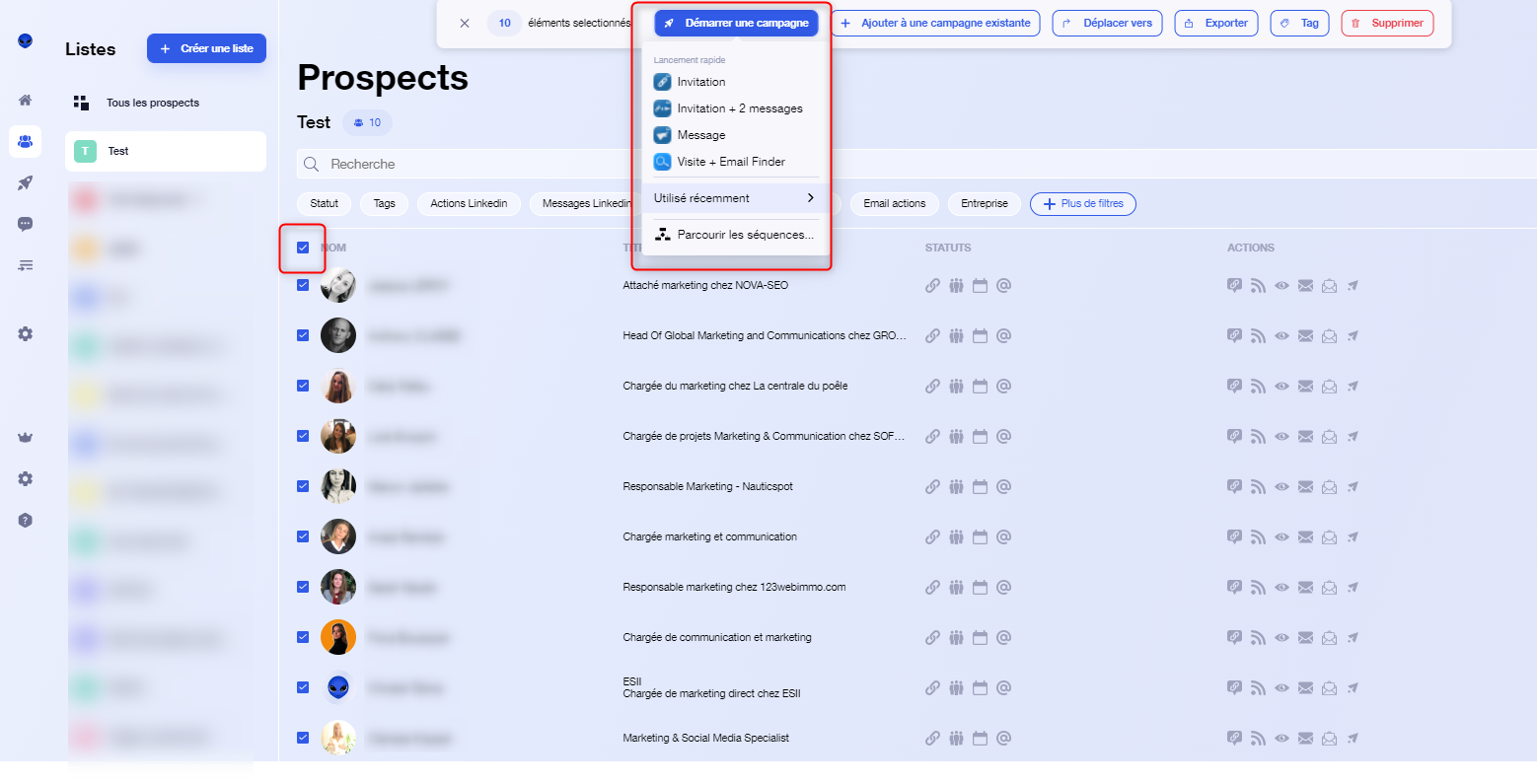 Vous pouvez sélectionner les leads que vous souhaitez mettre dans votre campagne, soit en utilisant les filtres pour segmenter cette liste, soit sélectionner tous les leads en cochant la case de sélection.
