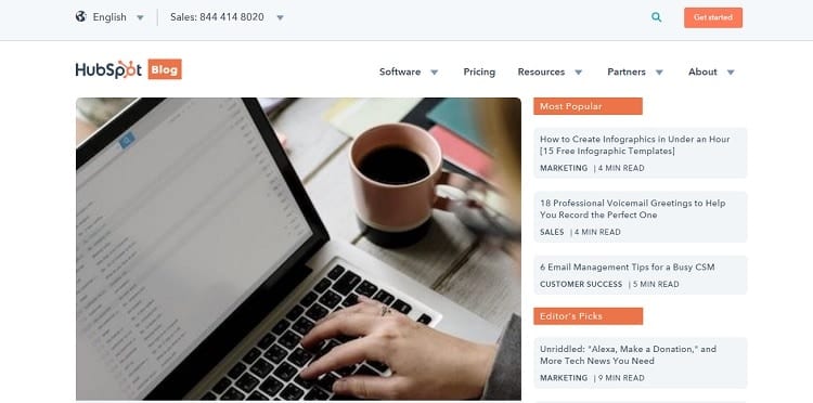HubSpot apparaît assez souvent dans les moteurs de recherche, et une grande raison est leur blog. Ils offrent un certain nombre d'articles et d'infographies pertinents visant les sujets entourant les services qu'ils offrent. Ce que HubSpot fait particulièrement bien, c'est présenter des articles populaires ainsi que des articles triés sur le volet par leurs éditeurs pour leur public cible.