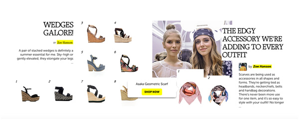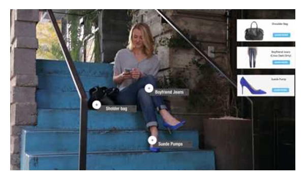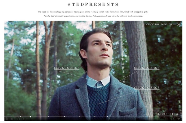 Video adalah bentuk konten yang paling kuat yang membangkitkan emosi dan menceritakan kisah dengan jelas tidak seperti media lainnya. Merek memberikan video gaya sinematik untuk menghibur serta menunjukkan detail produk dengan cara yang kreatif sambil tetap mempertahankan merek. Bahkan, brand dapat ditingkatkan melalui bentuk story telling. Video ini berisi pin interaktif yang dapat dibeli di mana pengguna dapat mengklik atau mengetuk apa yang menarik minat mereka. Salah satu contoh yang bagus adalah Ted Baker dengan kampanye mereka yang mengesankan, di mana hotspot belanja yang dapat diklik disematkan dalam video, di mana penonton dapat membuka informasi lebih lanjut dan membeli jika tertarik.