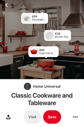 Dengan cara yang sama, Pinterest memungkinkan pengguna untuk membuat tag yang dapat dibeli untuk posting mereka. Hal ini memungkinkan seseorang untuk menambahkan informasi harga, link ke halaman produk dan CTA yang kuat. Berikut contoh tampilannya: