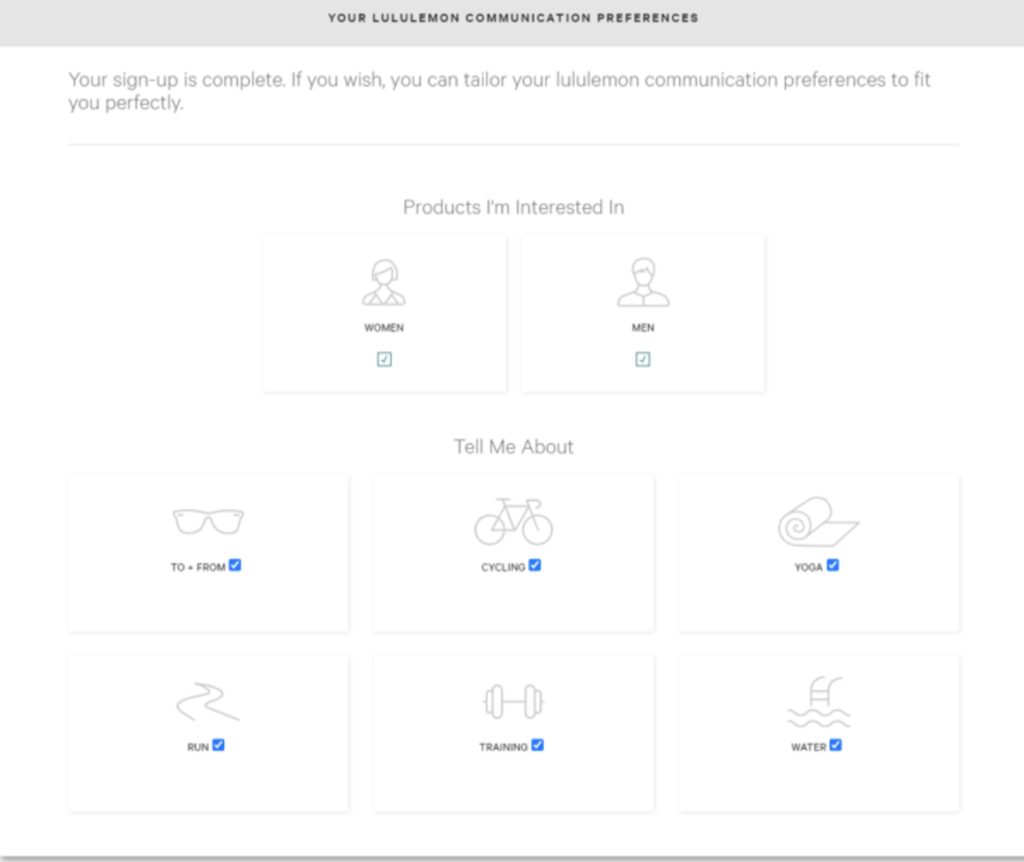Daftar ini singkat dan spesifik untuk penawaran produk Lululemon. Pilihan untuk "Wanita" atau "Pria" memastikan bahwa pelanggan hanya melihat pakaian yang akan mereka kenakan. Opsi tambahan menunjukkan bahwa mereka akan diperlihatkan produk yang terkait dengan aktivitas favorit mereka.